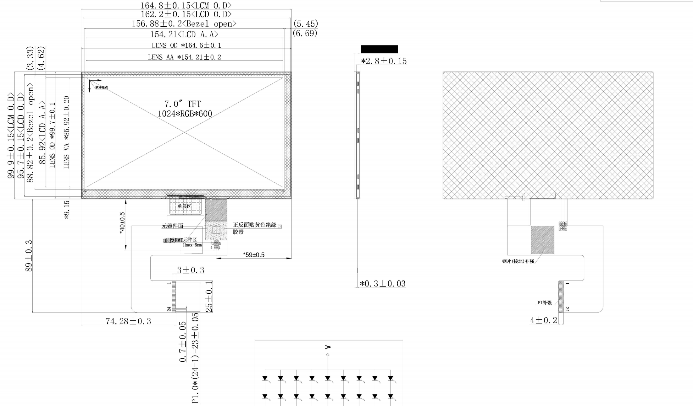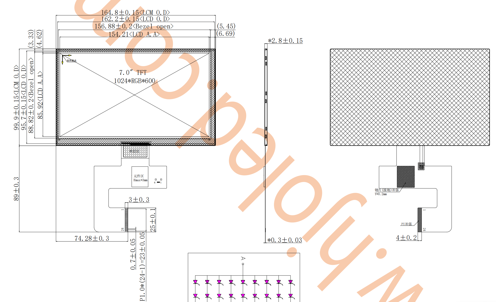 7-calowe poziome ekrany TFT mają zazwyczaj rozdzielczość 1024*600 i 4-kanałowy interfejs MIPI. Dwukanałowe ekrany LCD są rzadkie, a te integrujące pojemnościowy kabel ekranu dotykowego z kablem ekranu LCD są jeszcze rzadsze, co zwiększa obciążenie pracą inżynierów sprzętu. Inżynierom Shenzhen Hongjia Technology udało się wyprodukować masowo 7-calowe poziome ekrany IPS o rozdzielczości 1024*600, z 2-kanałowym interfejsem MIPI i pojemnościowym ekranem dotykowym. Złącze 24-PIN integruje ekran dotykowy i sygnały wyświetlacza za pomocą jednego interfejsu kablowego, co ułatwia projektowanie klienta.