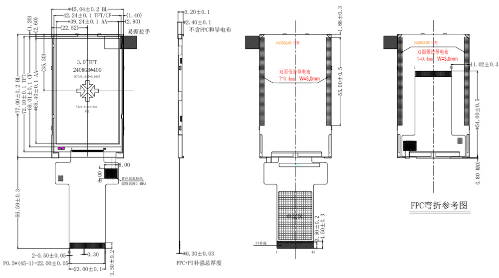 Pozycja Parametry Rozmiar 3,0 cala (przekątna) Typ panelu IPS Rozdzielczość 240 (RGB) * 400 (powszechnie znana jako WQVGA) Typ interfejsu Interfejs SPI i interfejs MCU Stan zasilania Zasilanie długoterminowe